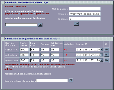 This form allow limitation to each domains (number of subzone, email account, or ftp account...). The right most popup tells what will be the IP for apache vhosts of this domain.