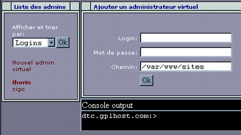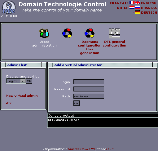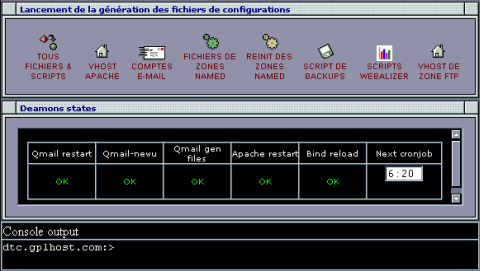 You can then either call the php script files from the root console to generate the config files, and relaunch the deamons (named, qmail-send, and apache) manually. You can of course rely on the /usr/share/dtc/admin/cron.php script, so everything is all automatic.